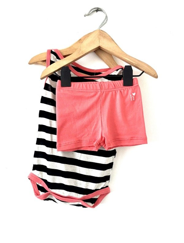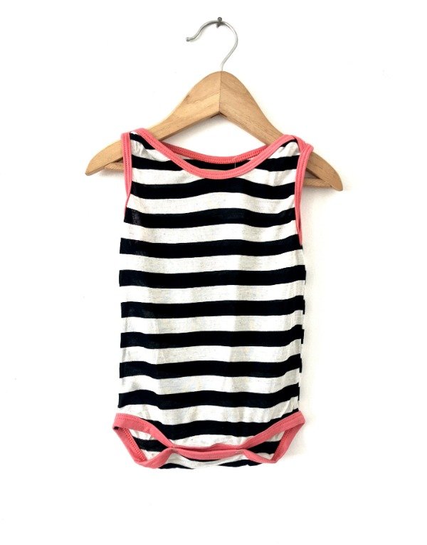 Body corte americano sin mangas realizado en jersey liviano rayado blanco y negro. Vivo contratono
