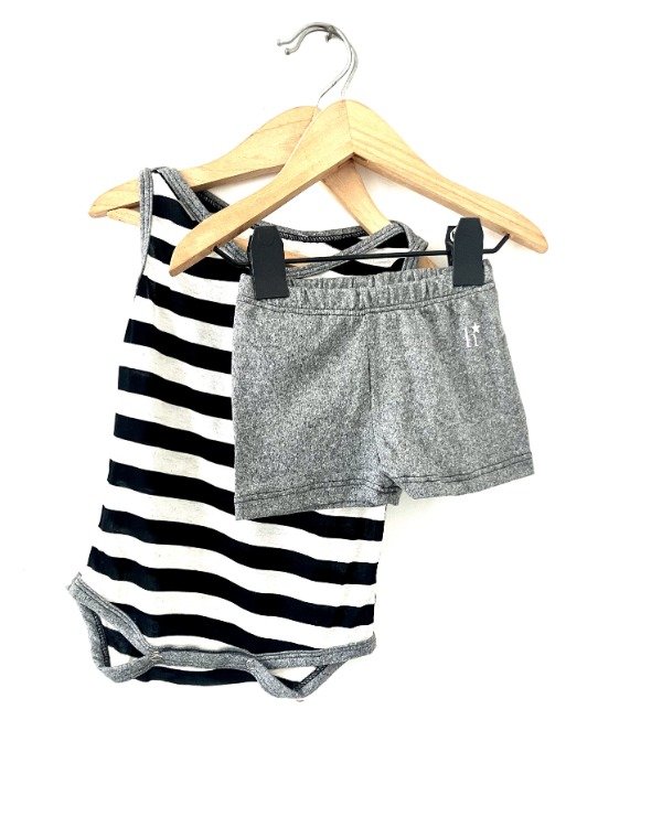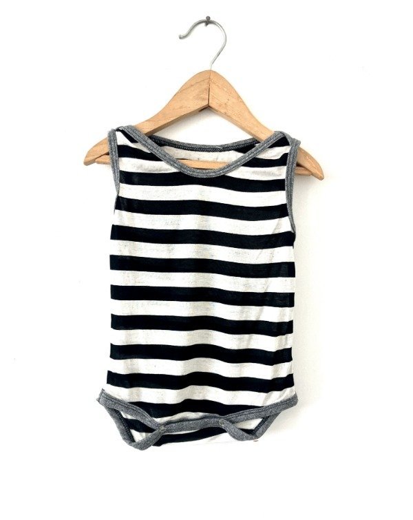 Body corte americano sin mangas realizado en jersey liviano rayado blanco y negro. Vivo contratono