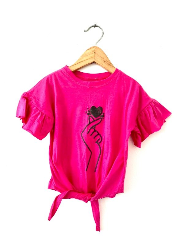 Jersey de algdón con estampa gris efecto puff. Mangas con volados y detalle de lazo en el frente