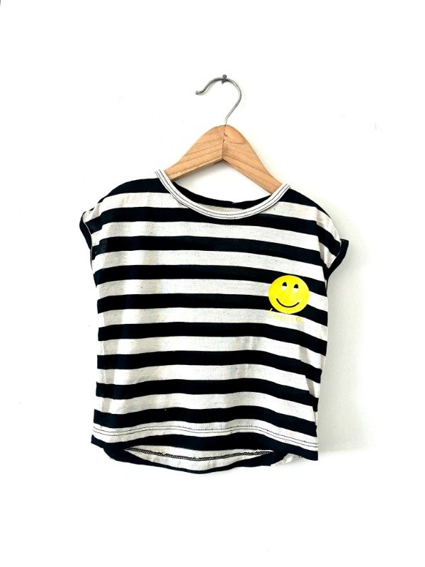 Remerón en jersey de algodón liviano rayado. Detalle de estampa amarilla